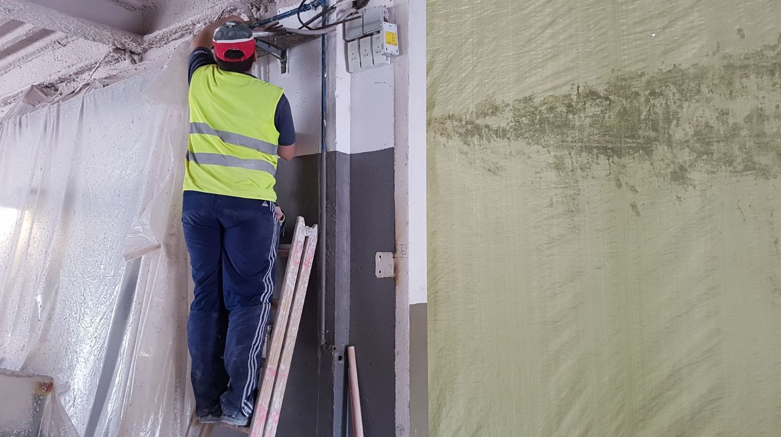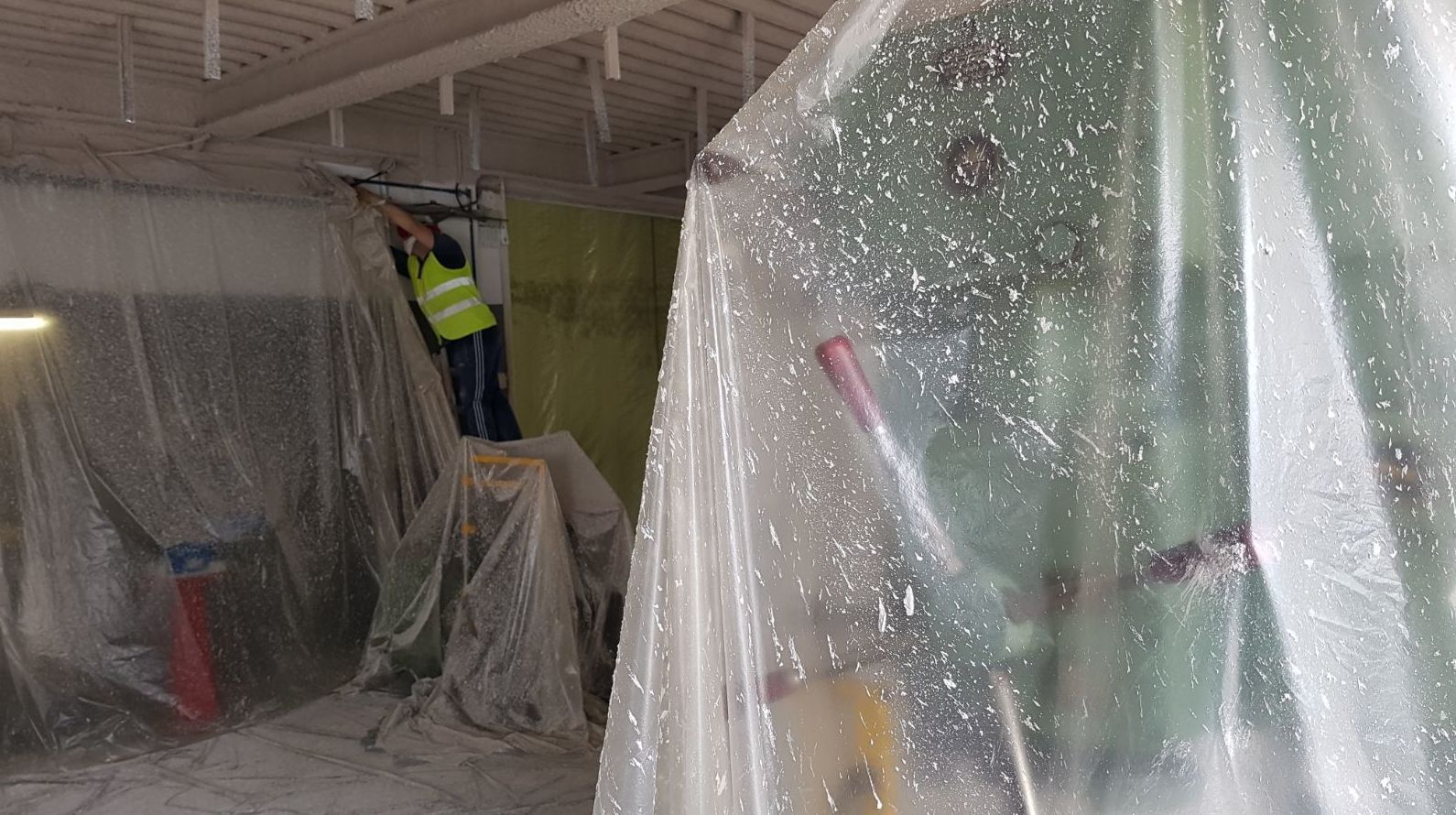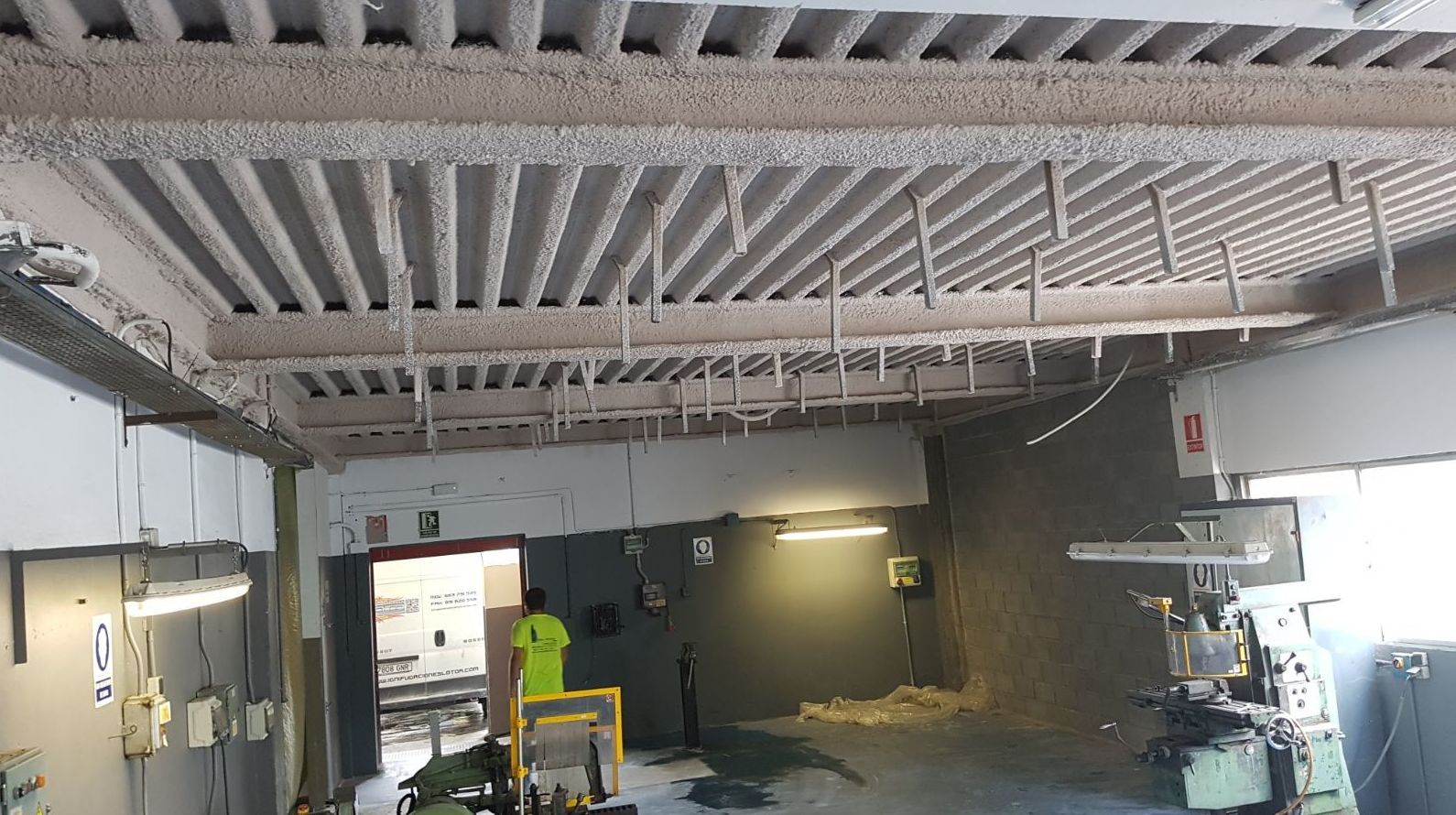 Proyectado de mortero Igniver en techo y estructuras metálicas, a fin de alcanzar una resistencia al fuego de 120 minutos.