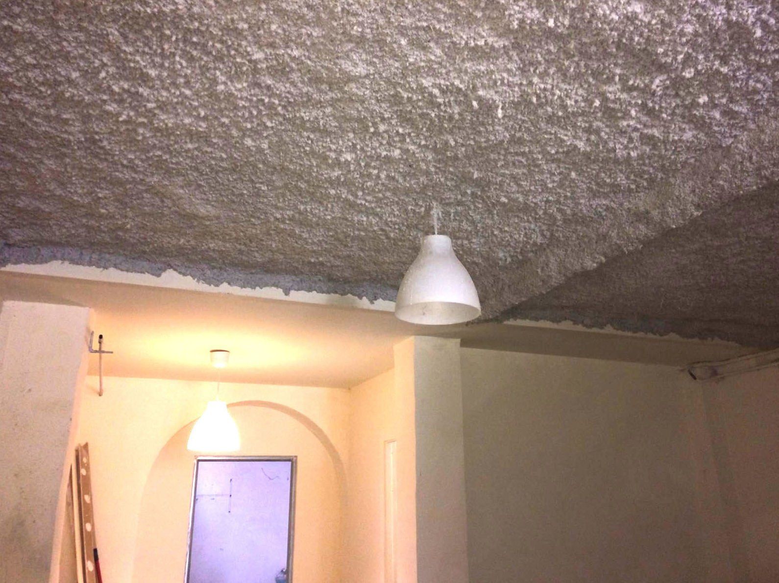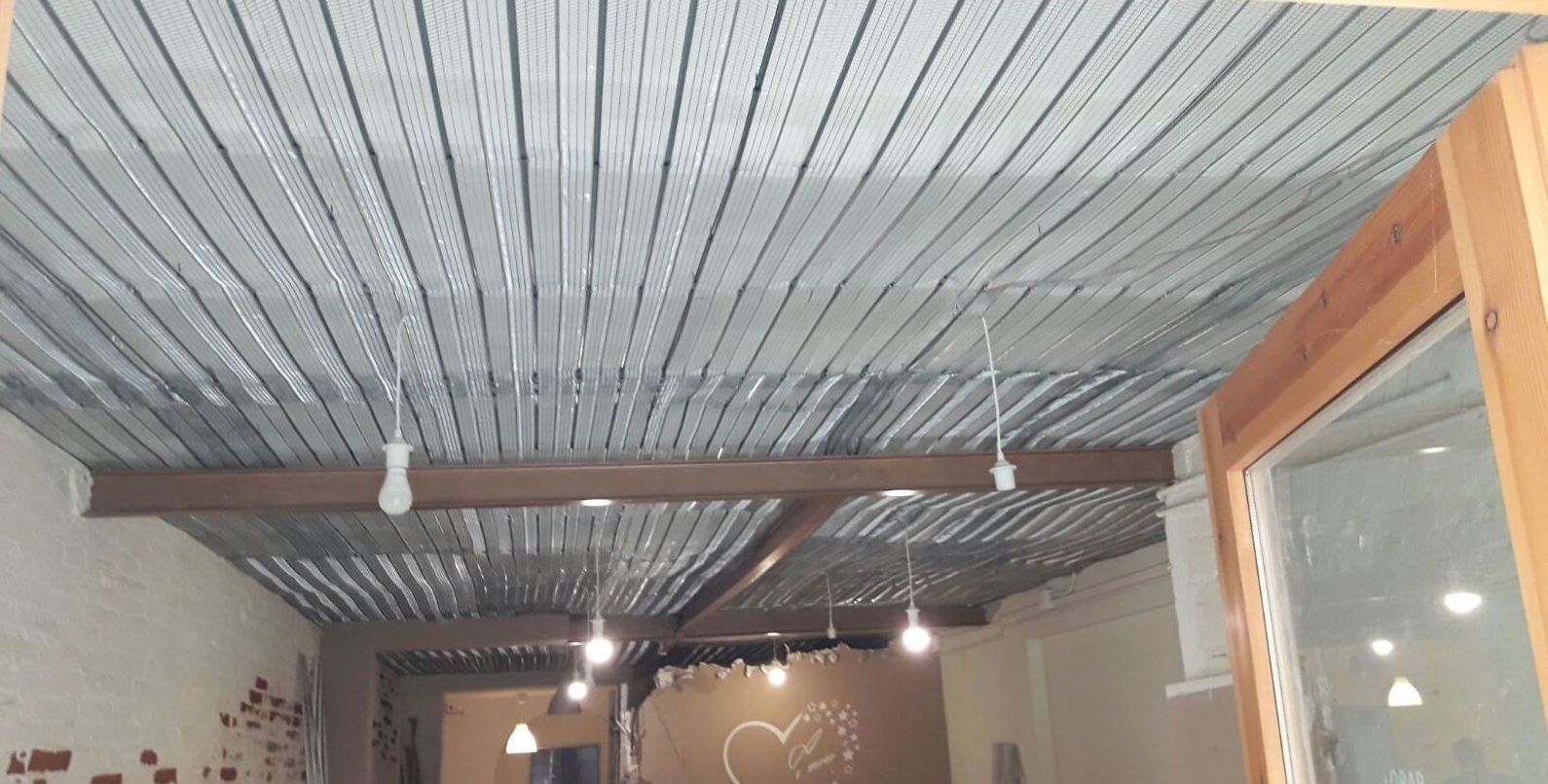 Proyectado de mortero de lana de roca, a fin de conseguir una protección ante el fuego de 120 minutos, sobre vigas de estructura metálica y sobre un techo con vigas de madera con previa instalación de malla nervometal plana de corrido.