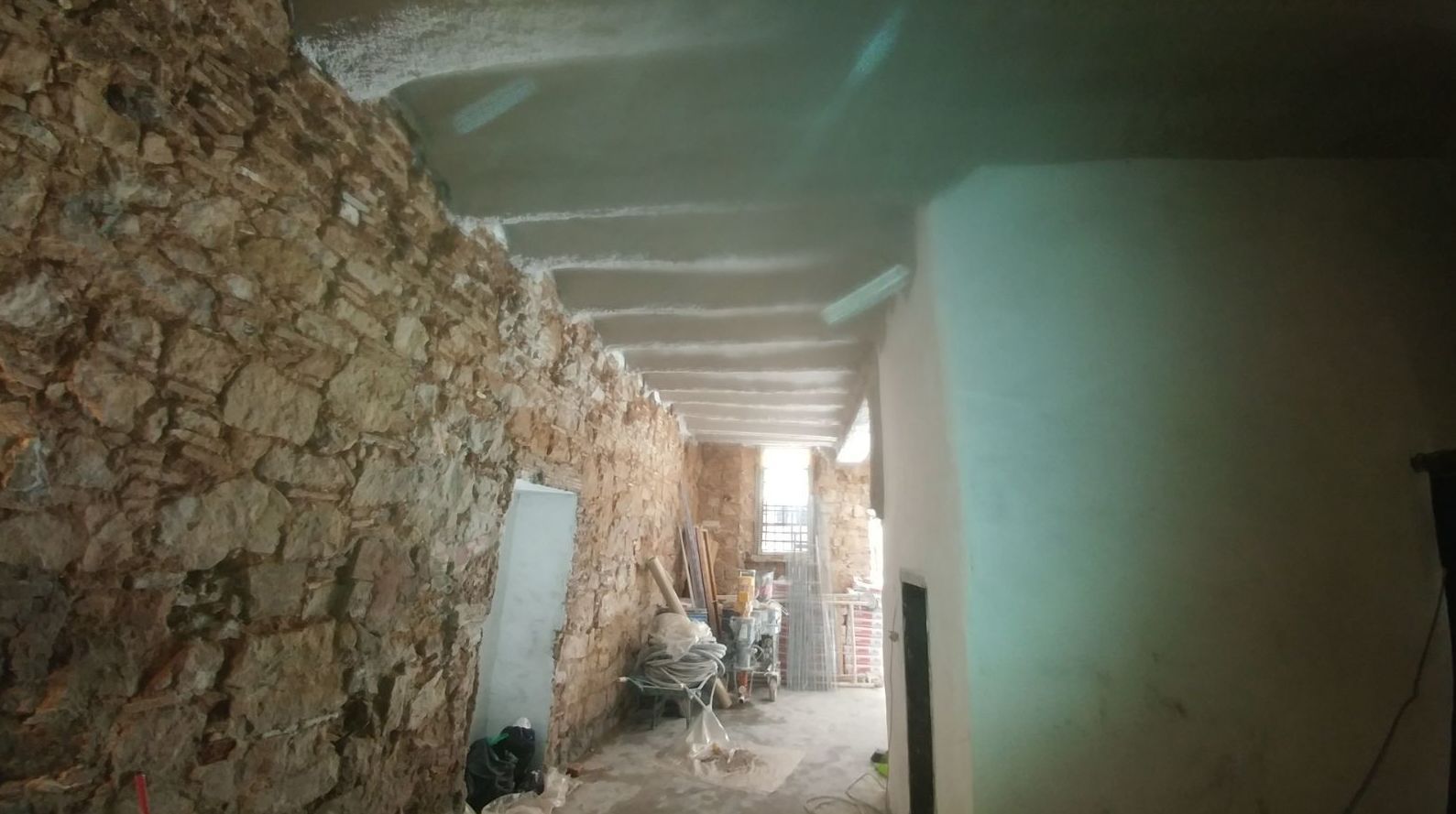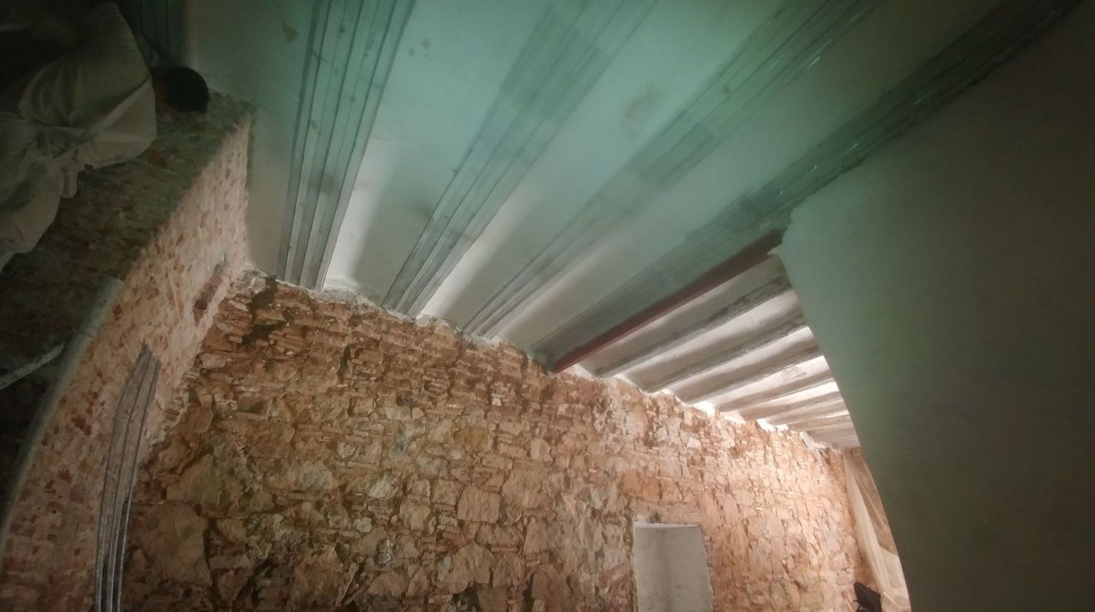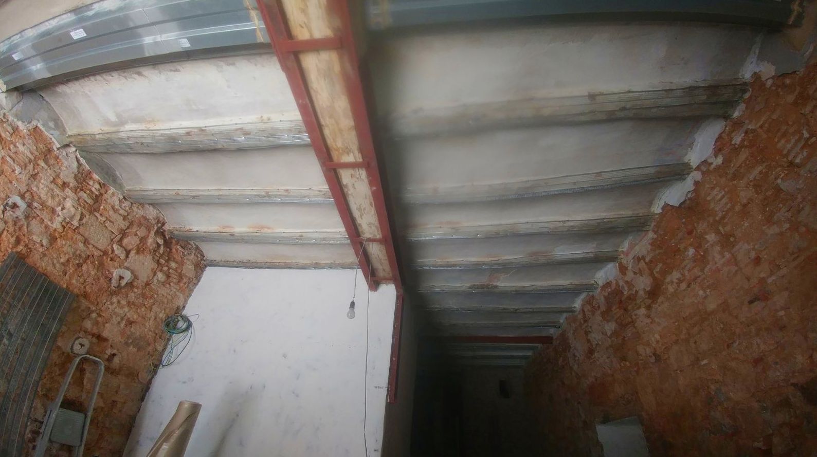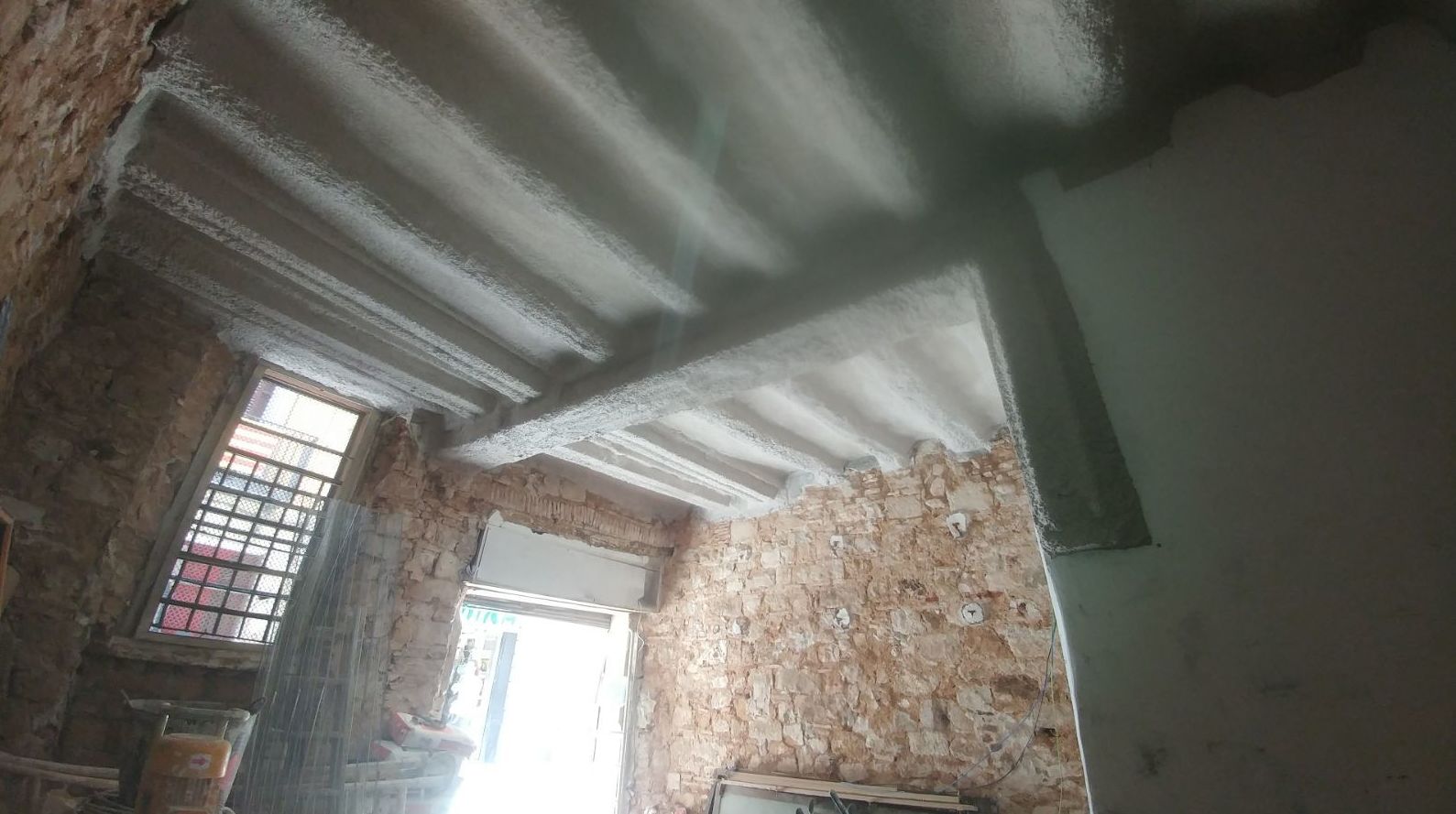 Protección de vigas de madera con malla nervometal y perfiles de estructura metálica con mortero Igniver, para una resistencia al fuego de R120.