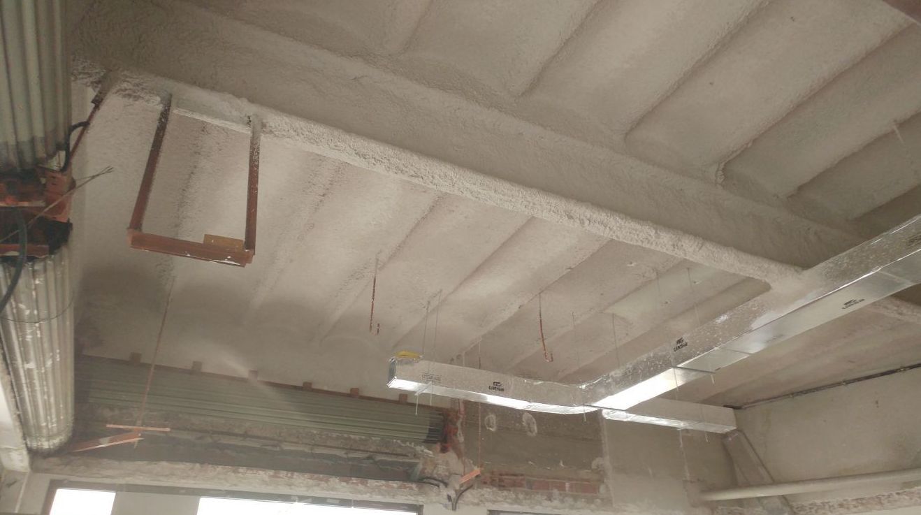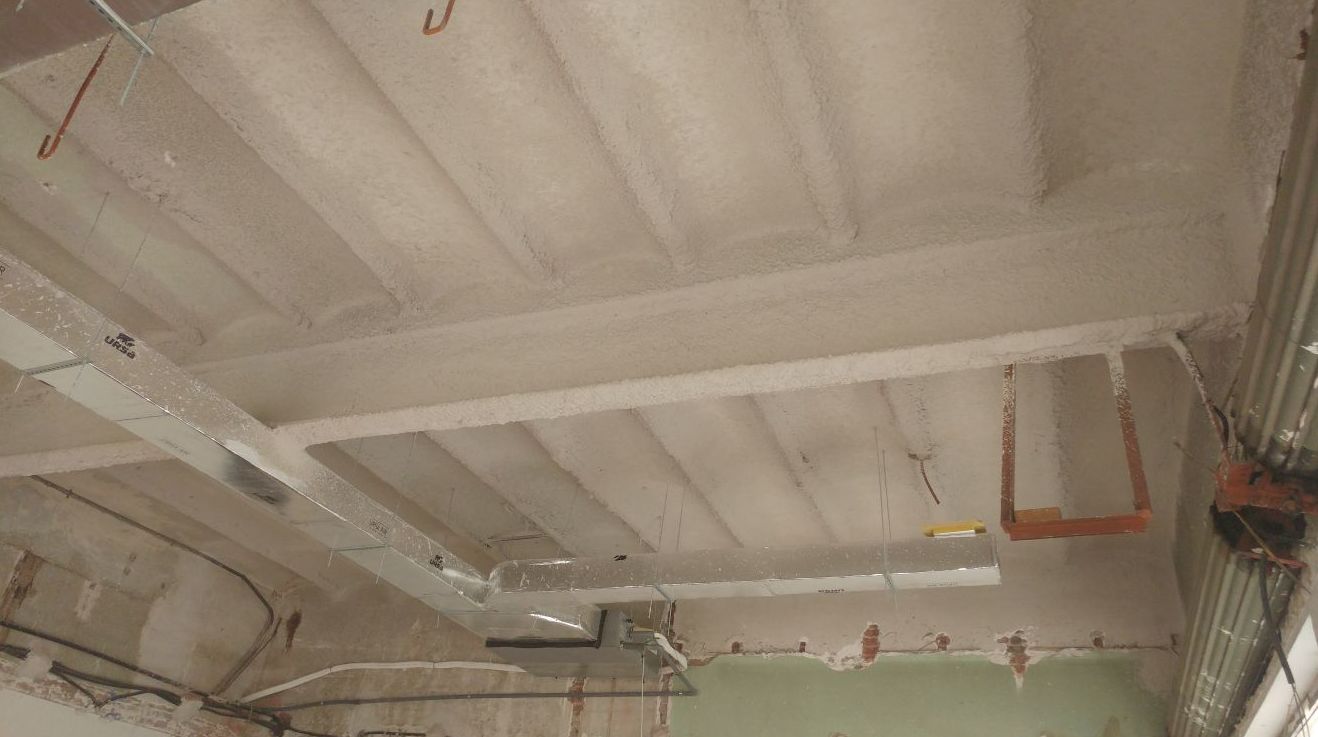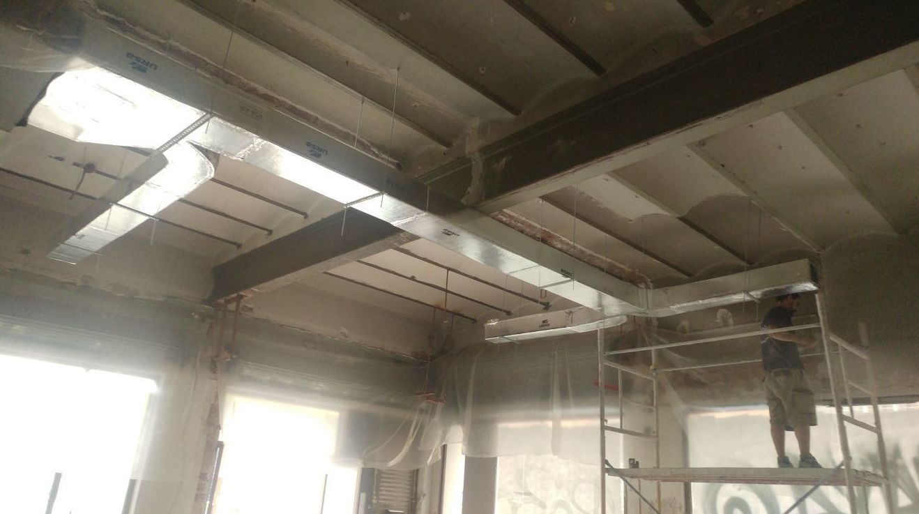 Aplicación de mortero Igniver sobre perfiles metálicos, a fin de alcanzar una estabilidad frente al fuego de 90 minutos.