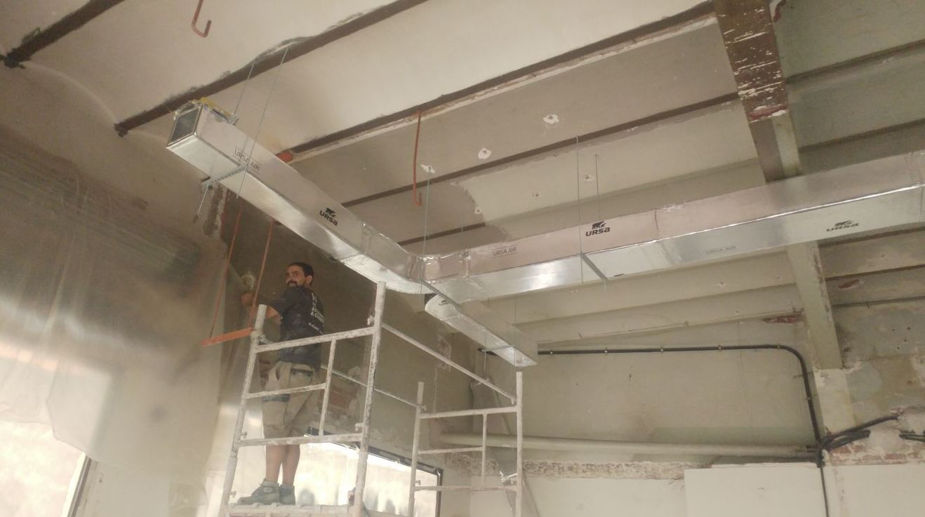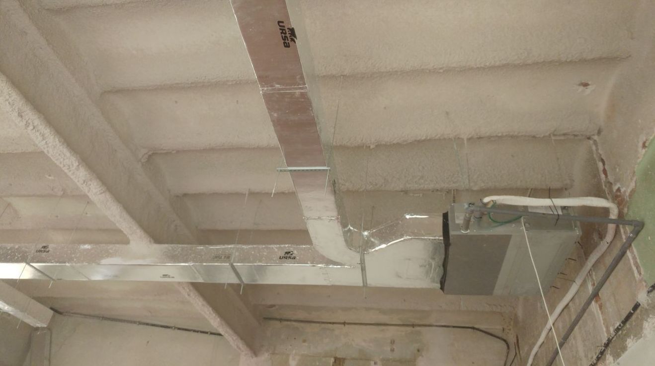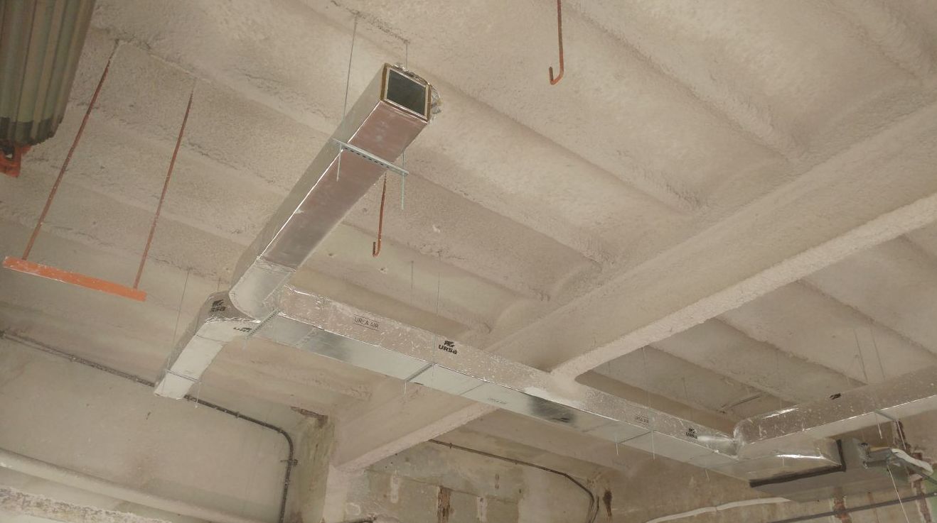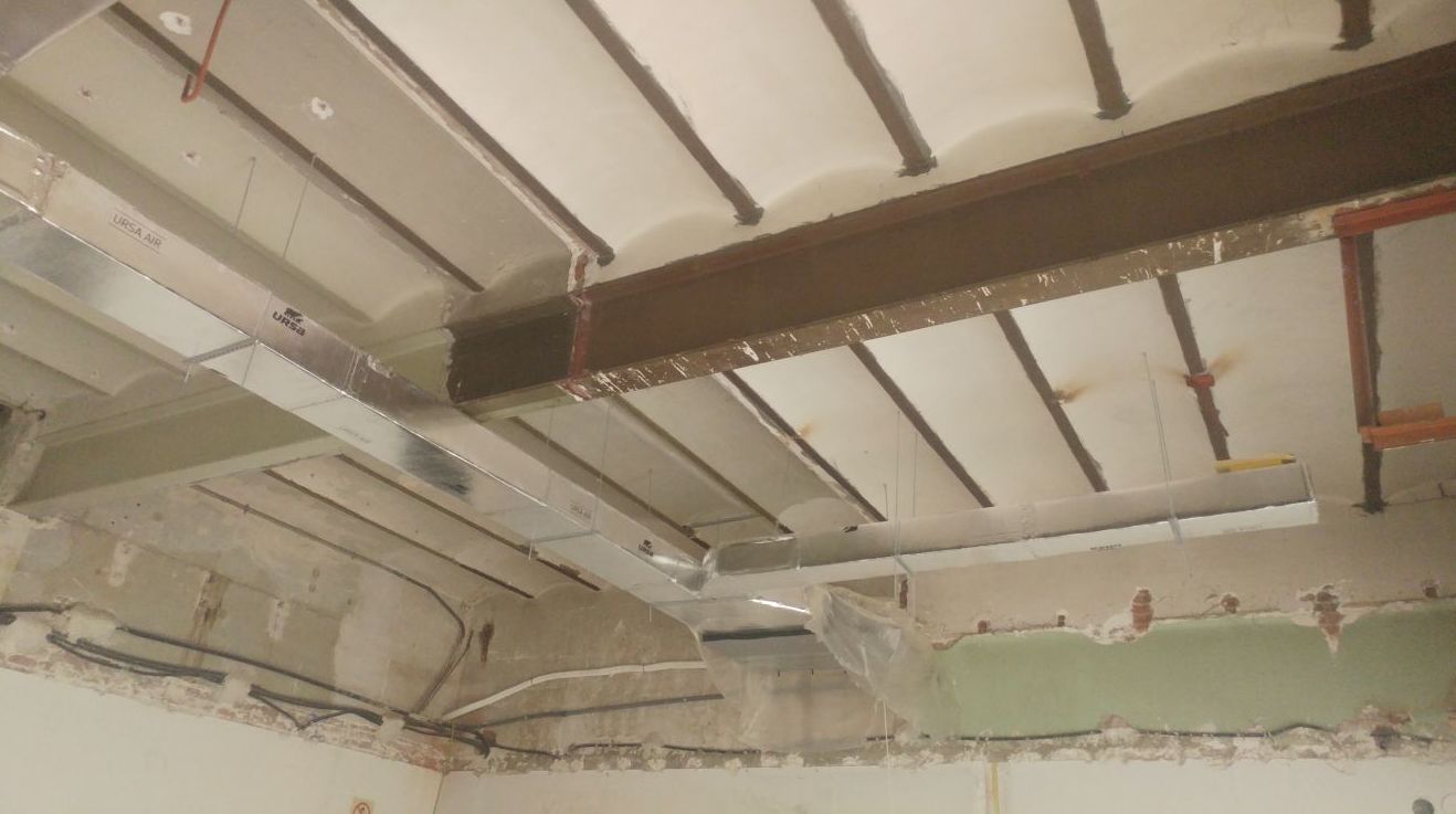 Aplicación de mortero Igniver sobre perfiles metálicos, a fin de alcanzar una estabilidad frente al fuego de 90 minutos.
